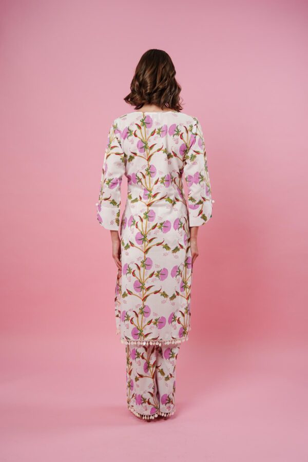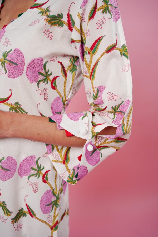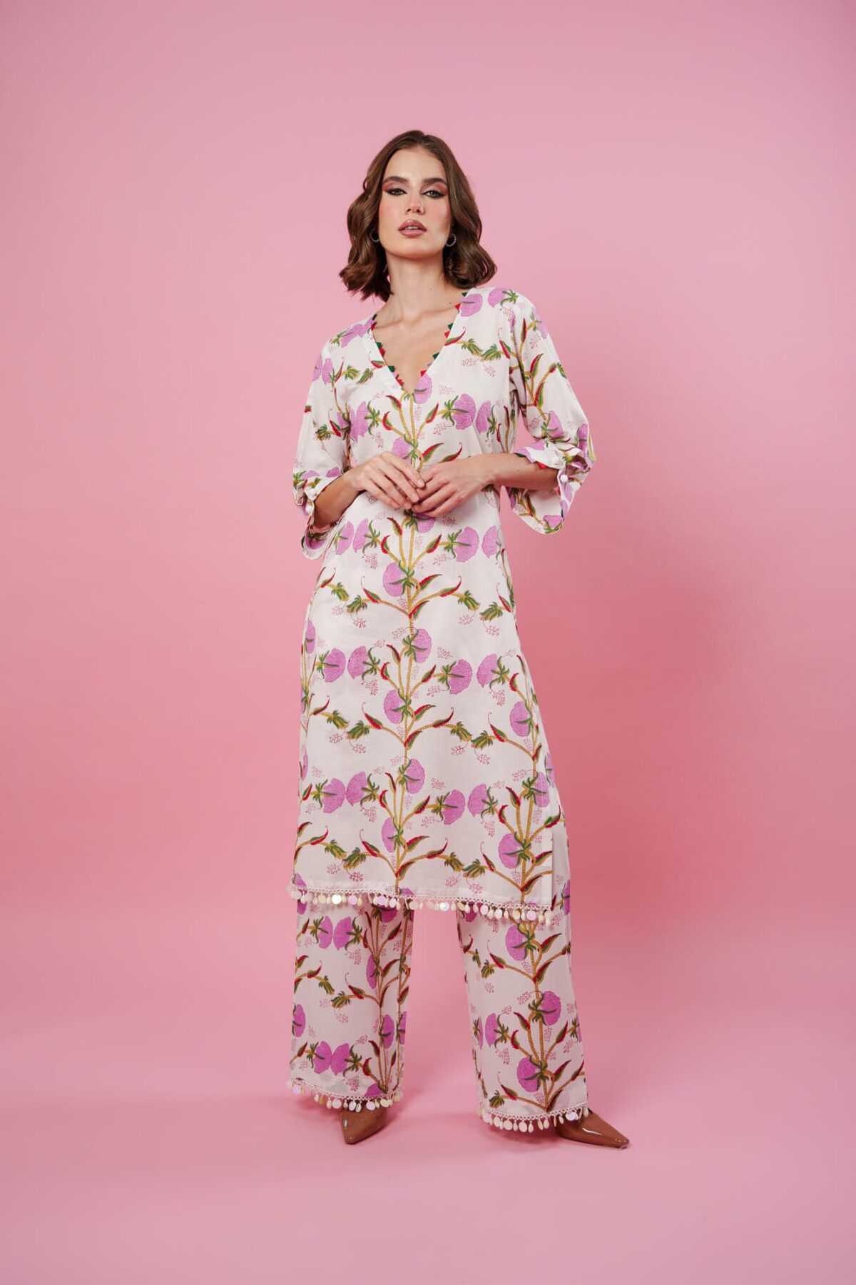 -This set features a stylish neckline and sleeves with coordinating pants.