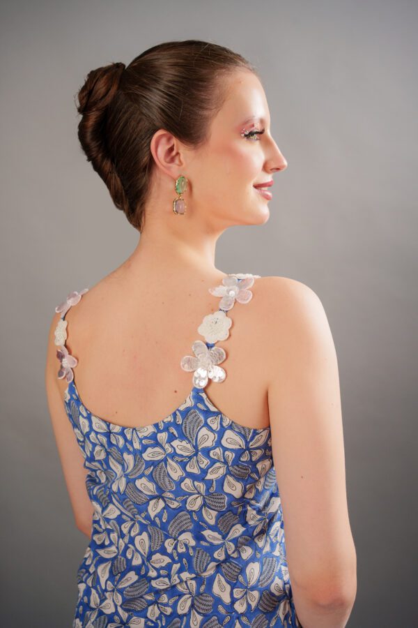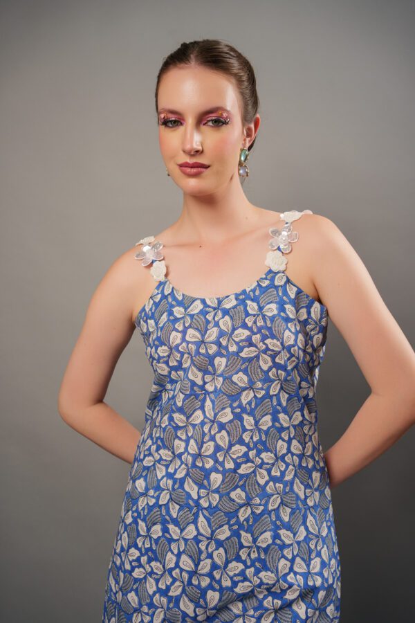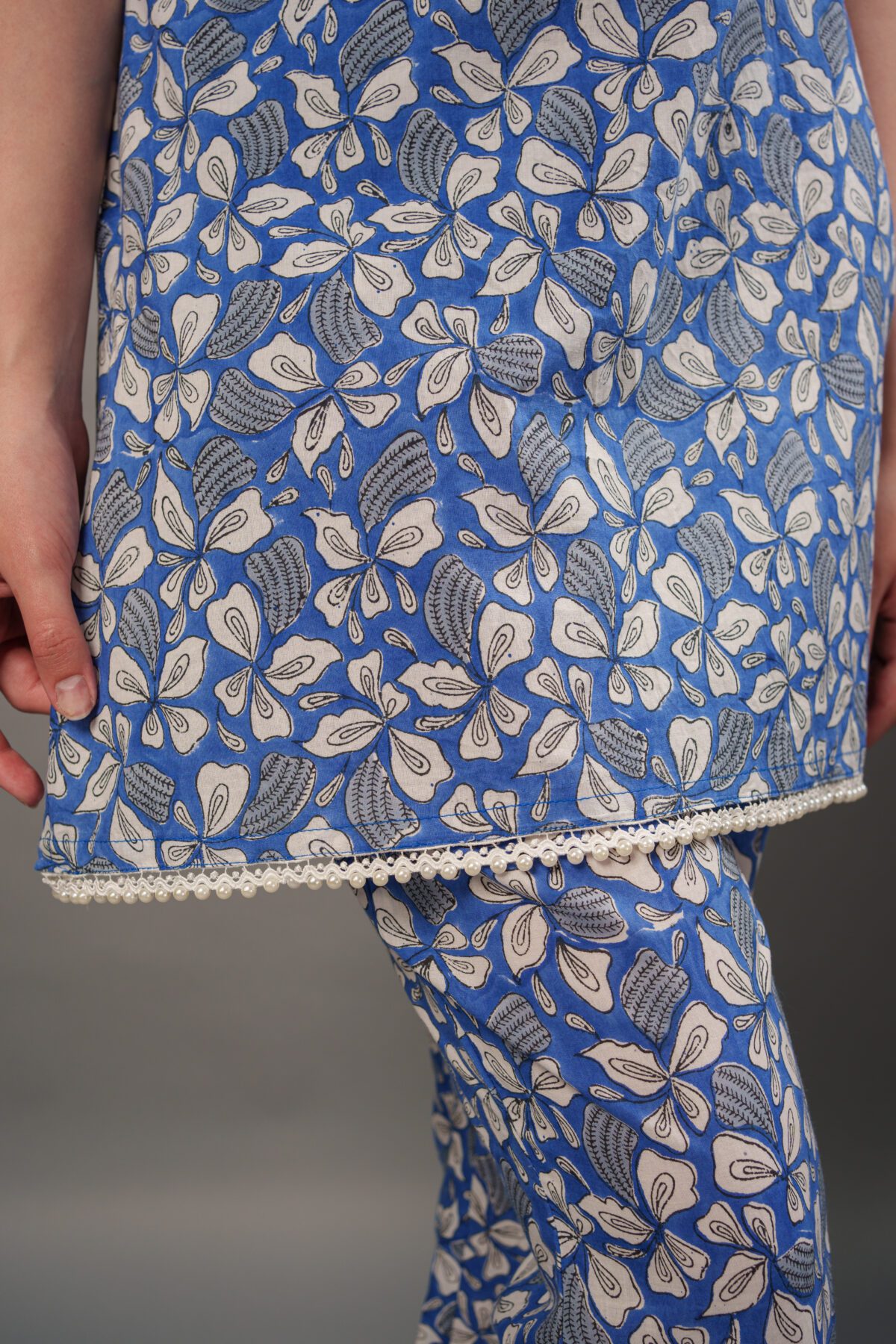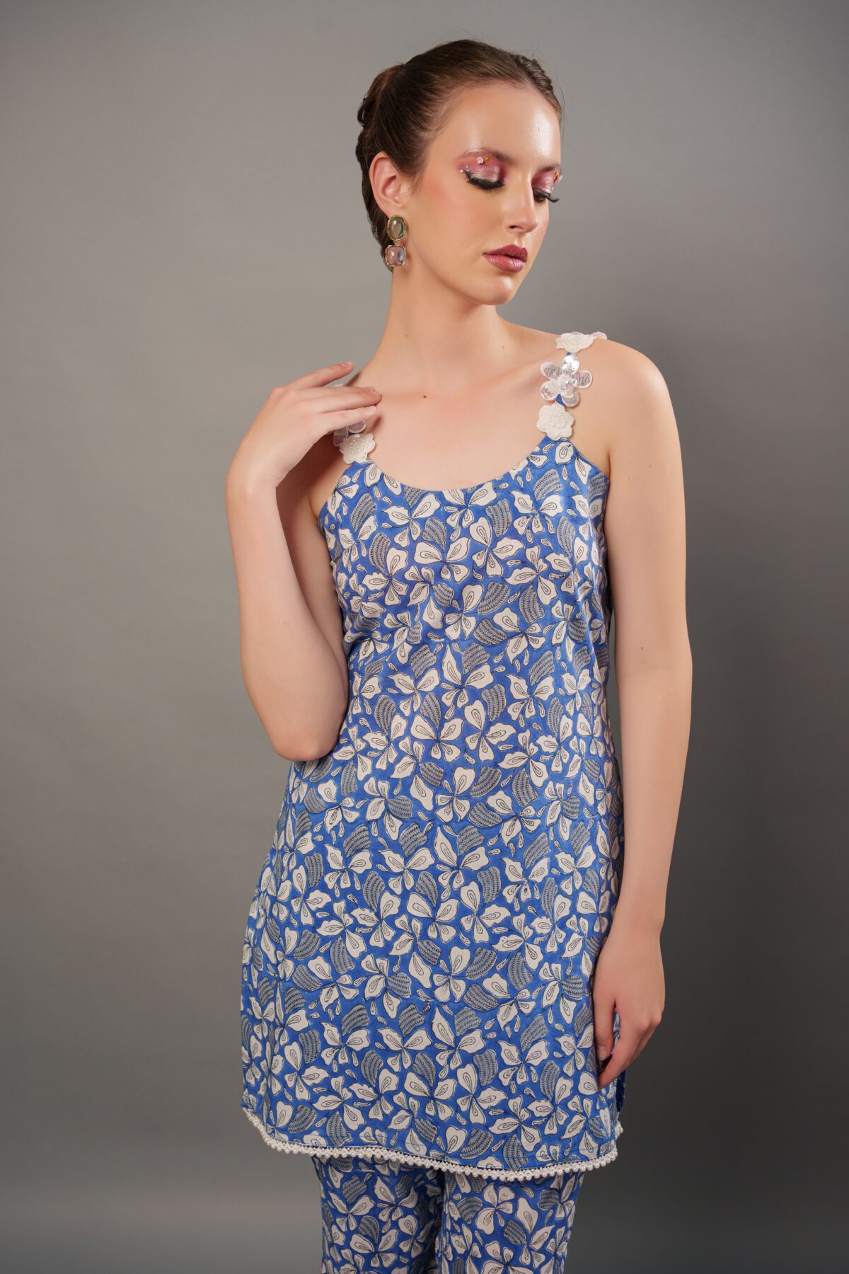 Our Sapphire Set exudes subtle elegance with its intricate detailing and classic design. This two-piece coord set features a sleeveless kurta, delicately embellished with sequin roses on the shoulder for a touch of glamour. Paired with coordinating pants, both pieces are crafted from 100% handblock printed cotton, offering breathable comfort and timeless style.